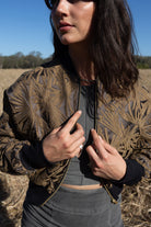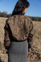 The IDIS Reversible bomber jacket has a gold star brocade outer and a mid weight Black silk lining that can be reversed to wear the silk on the outside.
