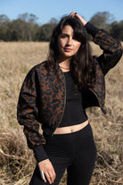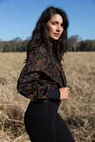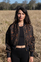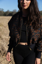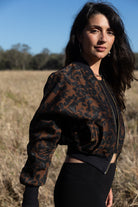 The IDIS Reversible bomber jacket has a chocolate brown leopard brocade outer and a mid weight Black silk lining that can be reversed to wear the silk on the outside.