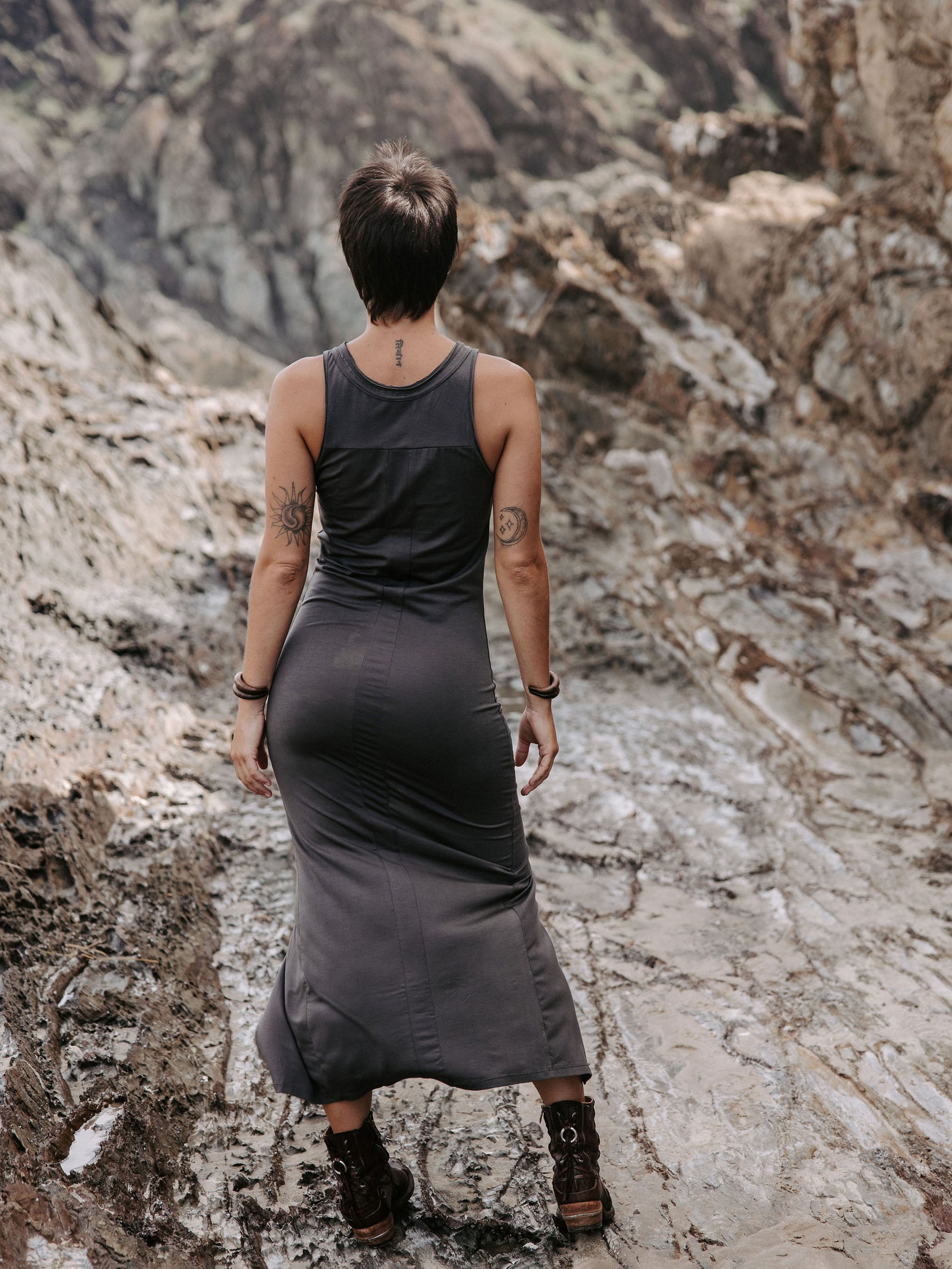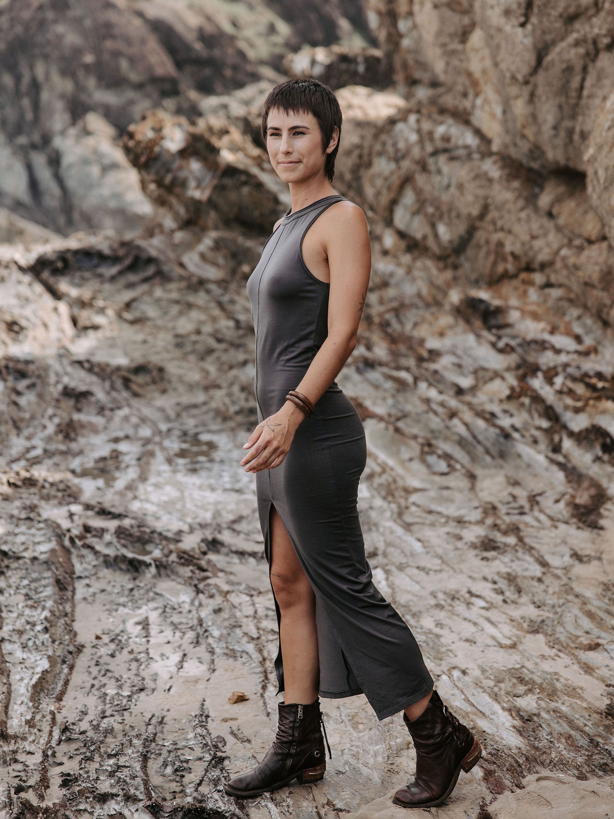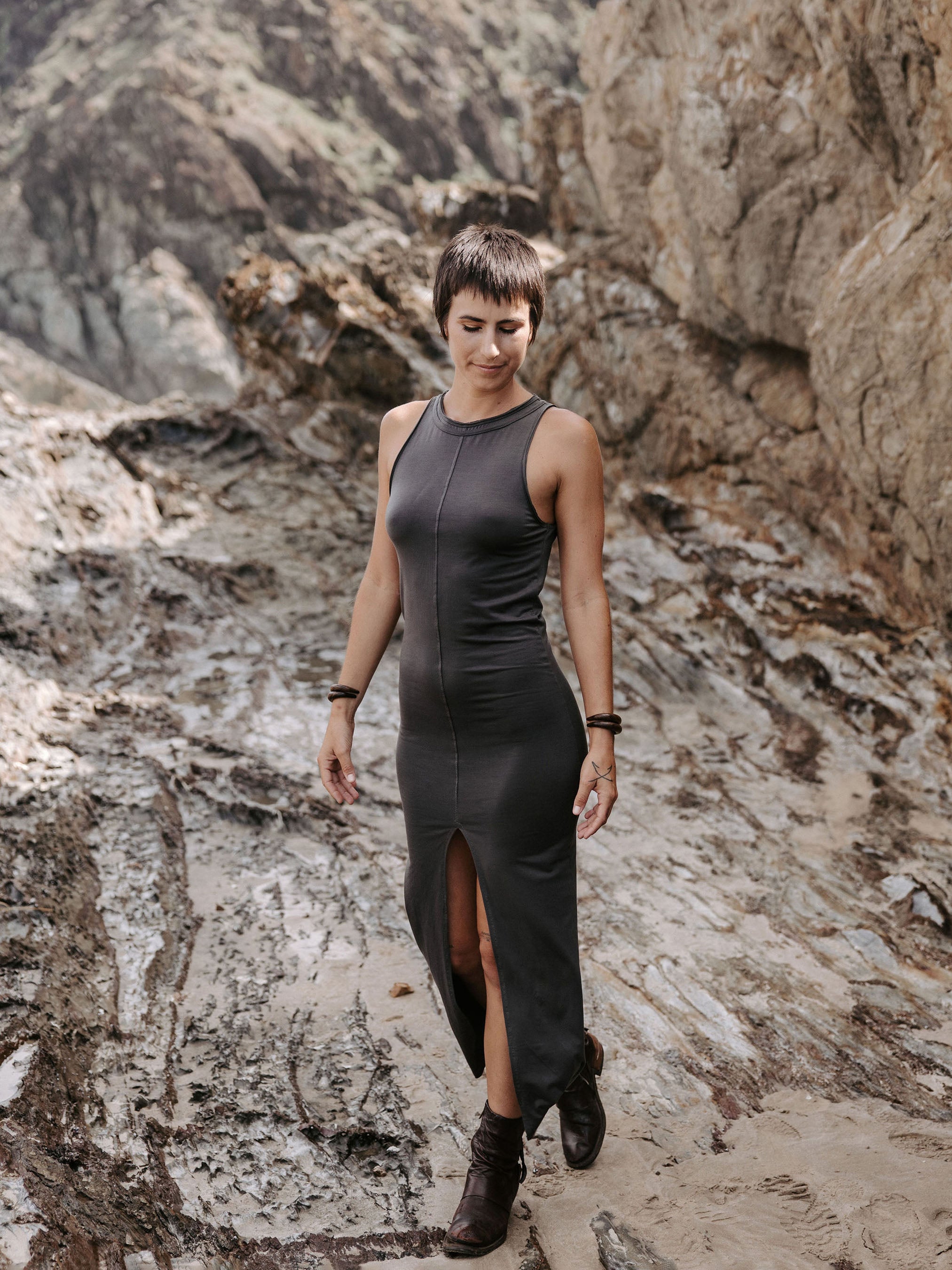 Our Slinky B dress, is a form fitting tank dress with high front split and a soft bamboo like feel.