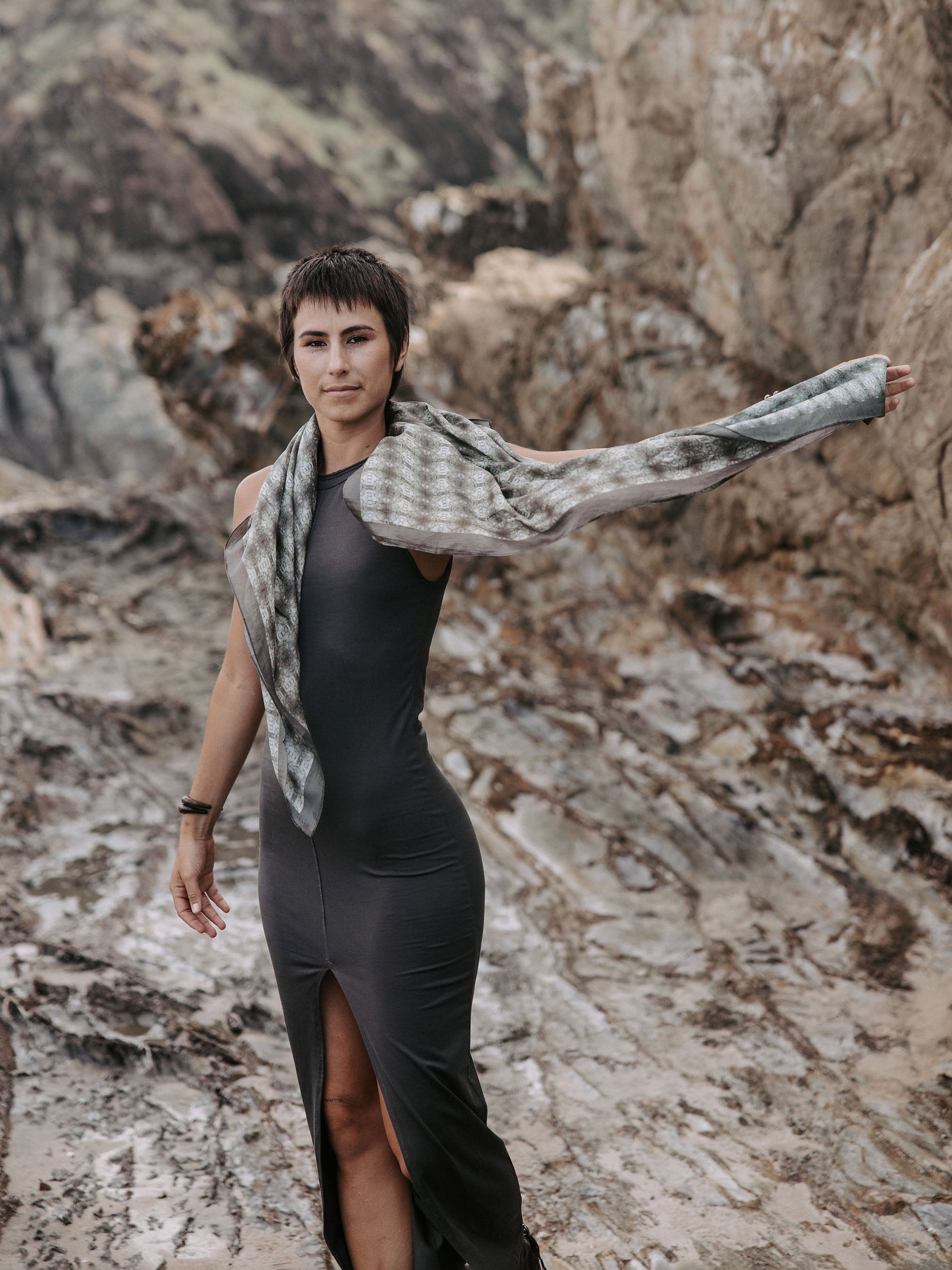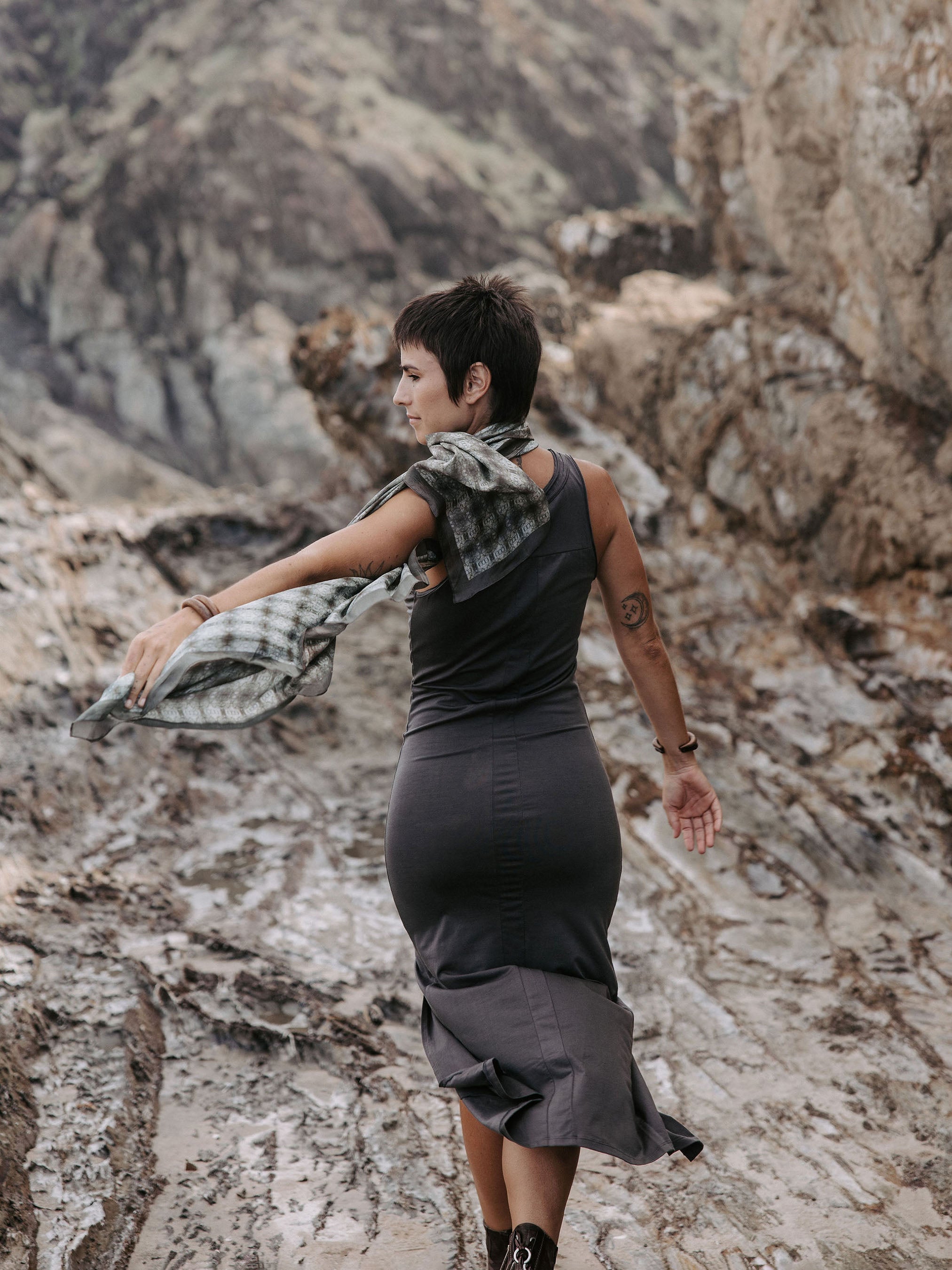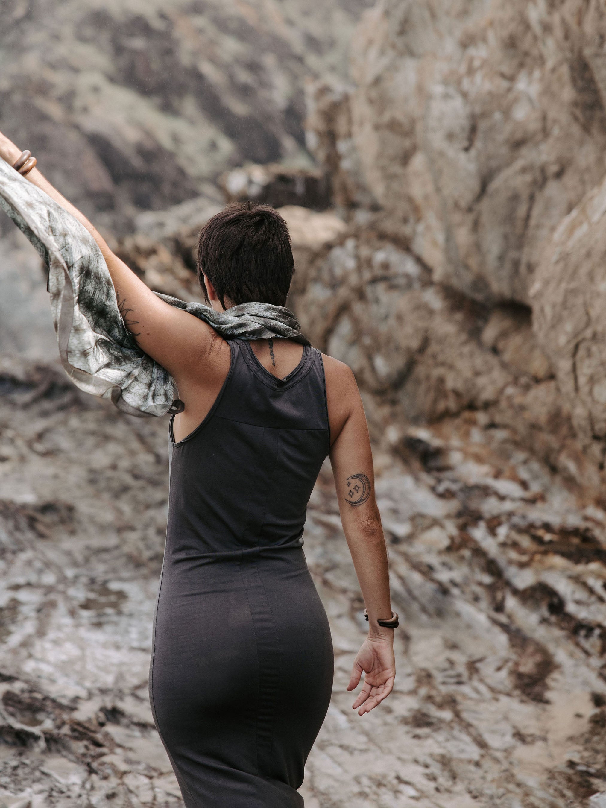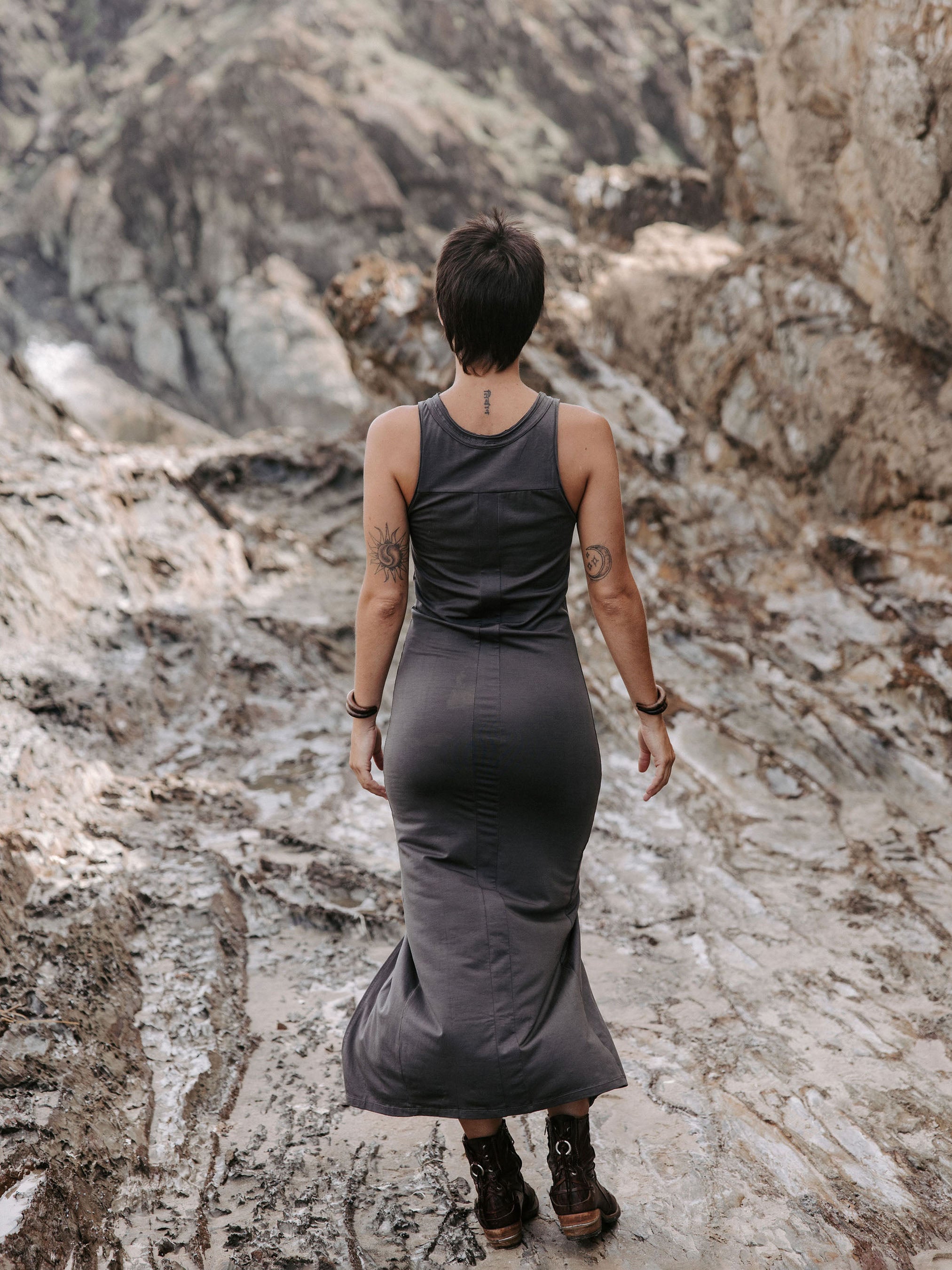 Our Slinky B dress, is a form fitting tank dress with high front split and a soft bamboo like feel.