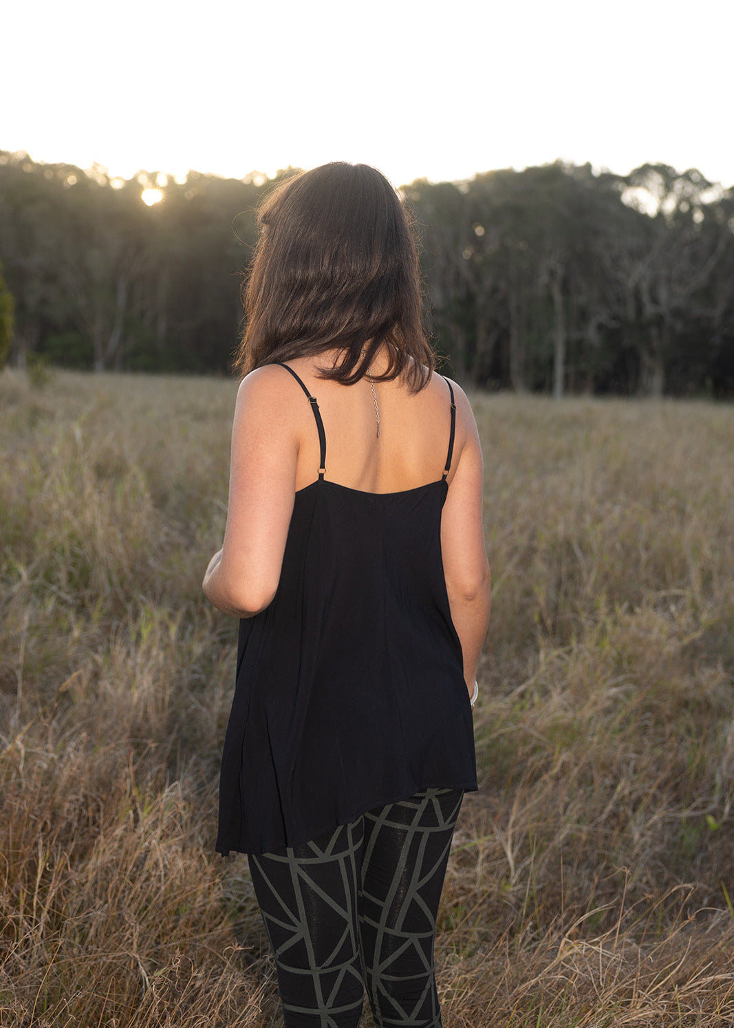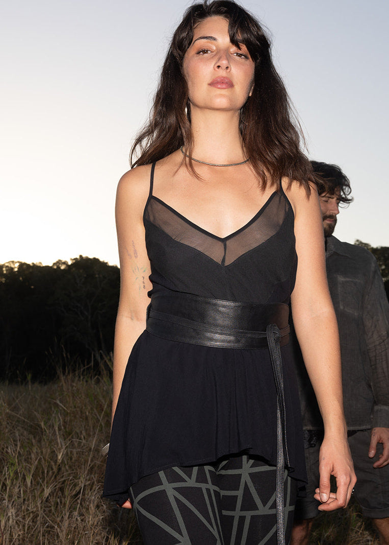 The main body is a mid weight rayon giving it that drape we love, while the neckline is in a silk chiffon for a touch of lux and transparency. Straps are adjustable.
