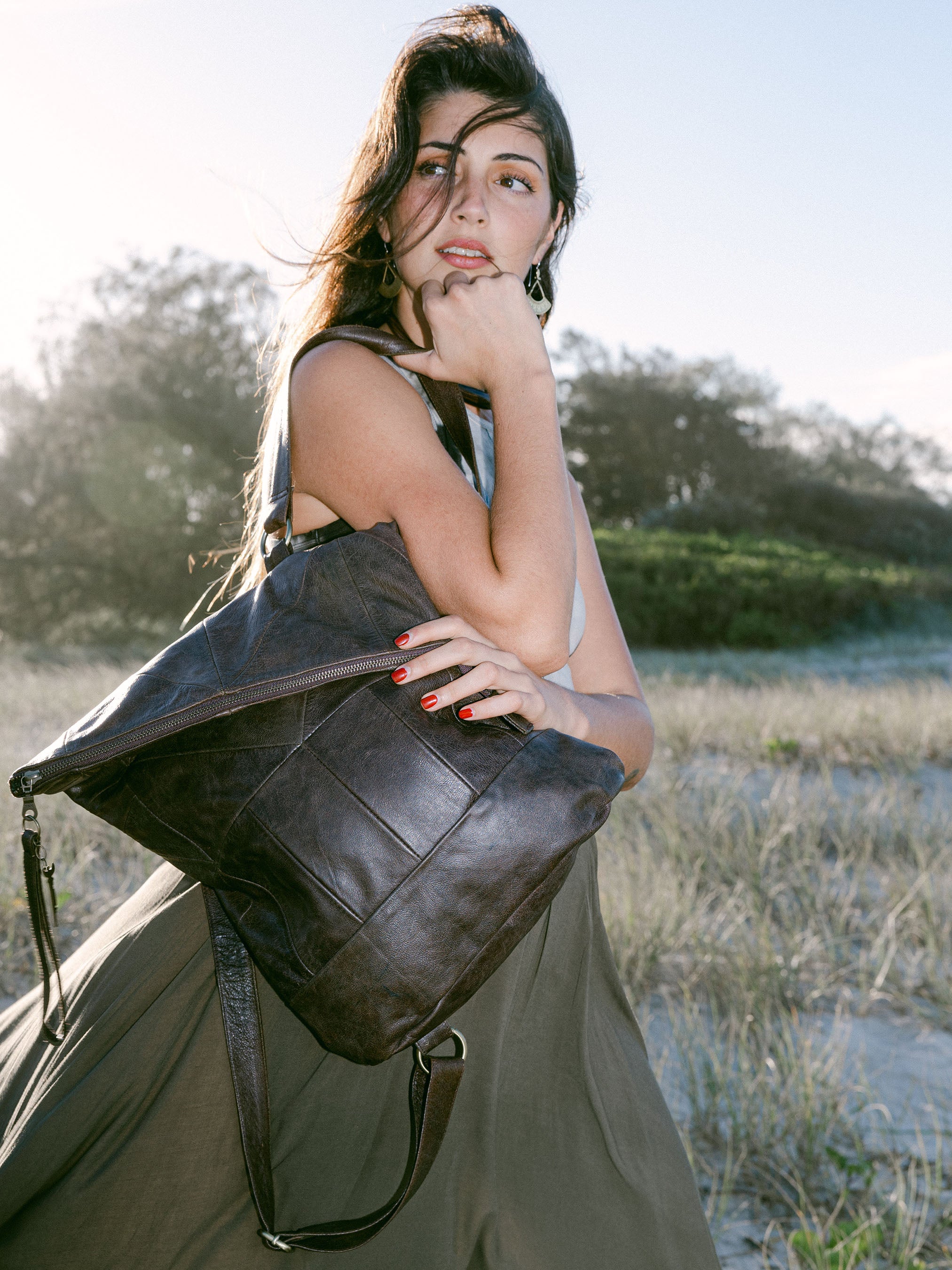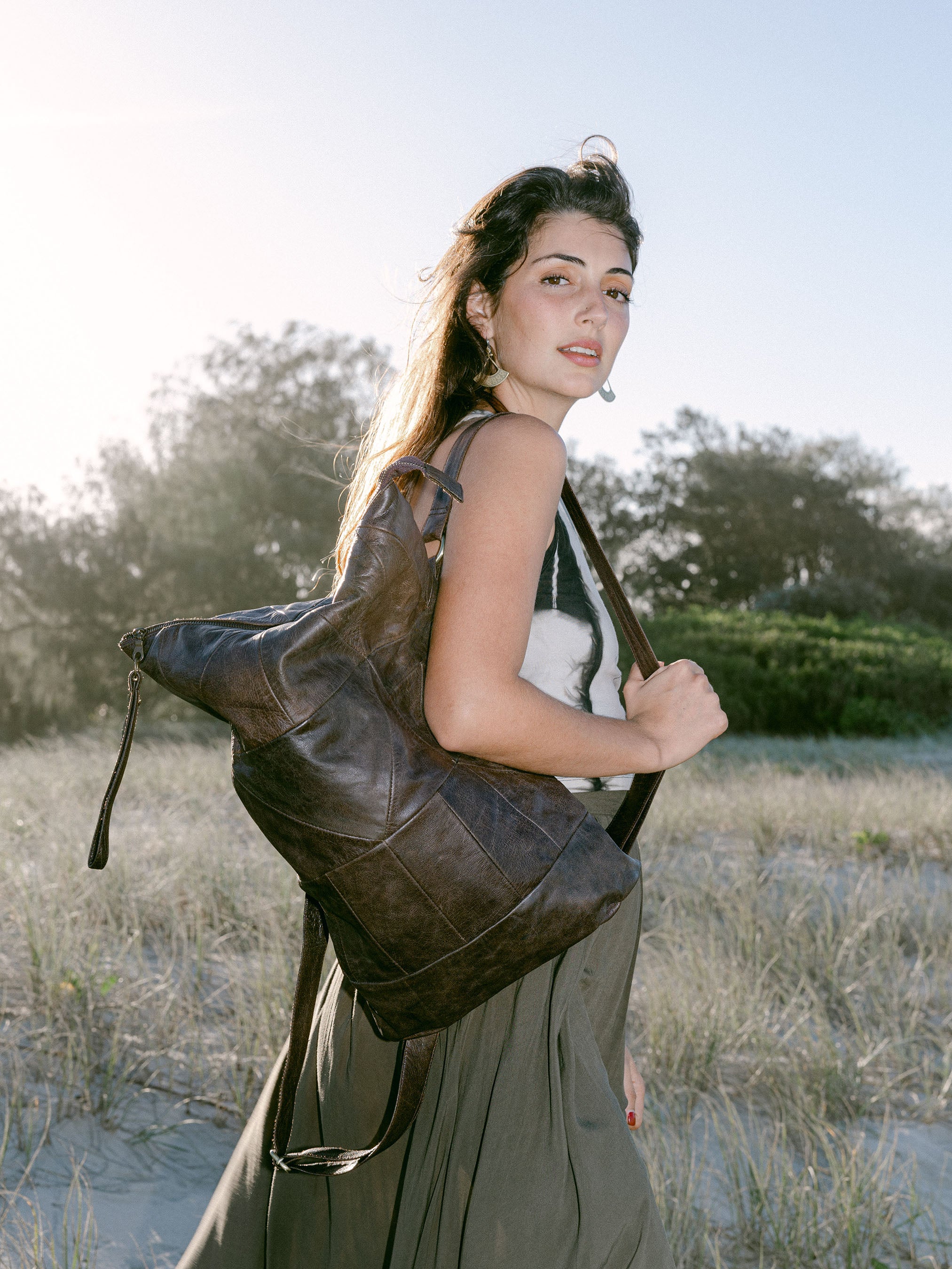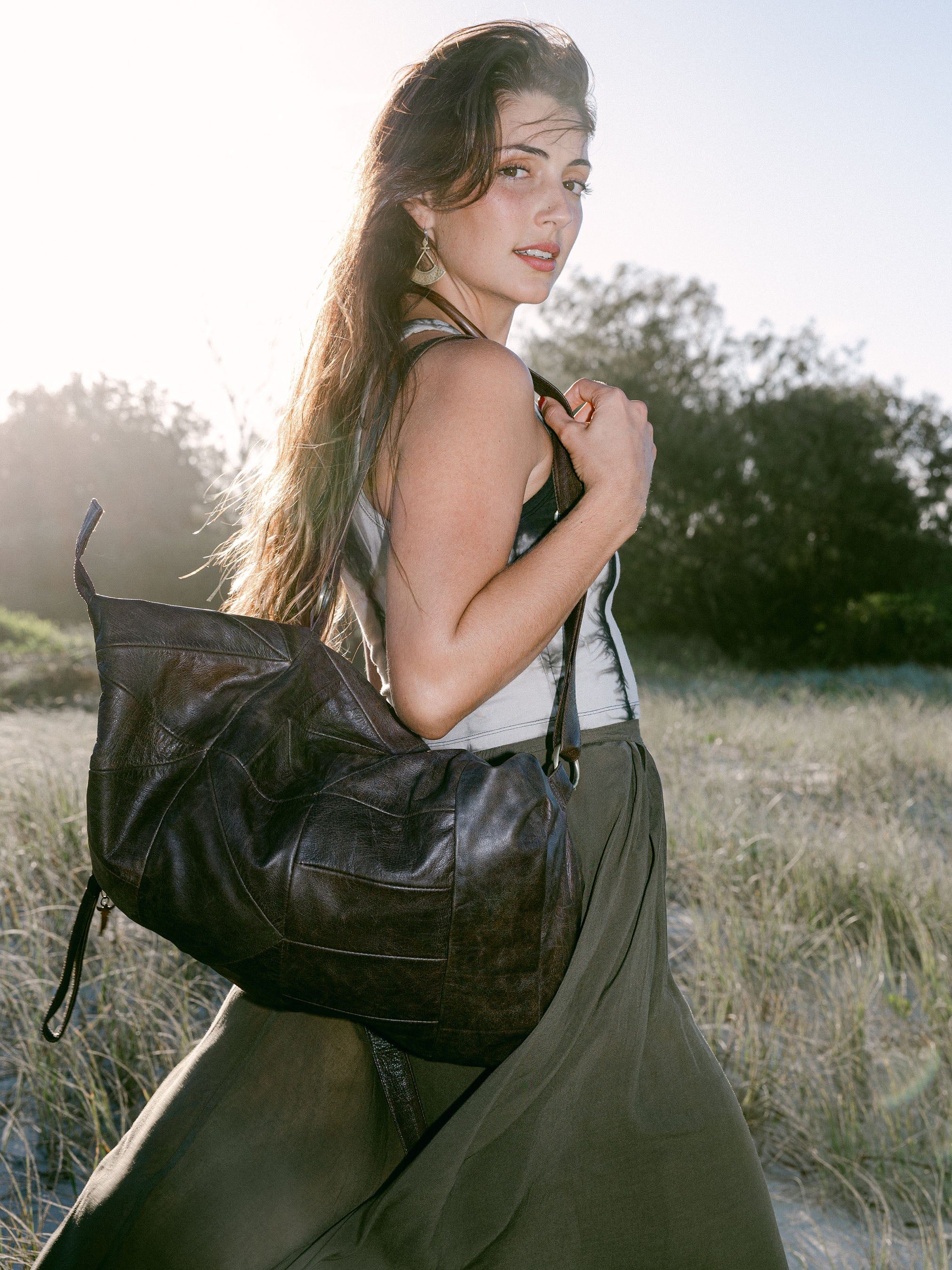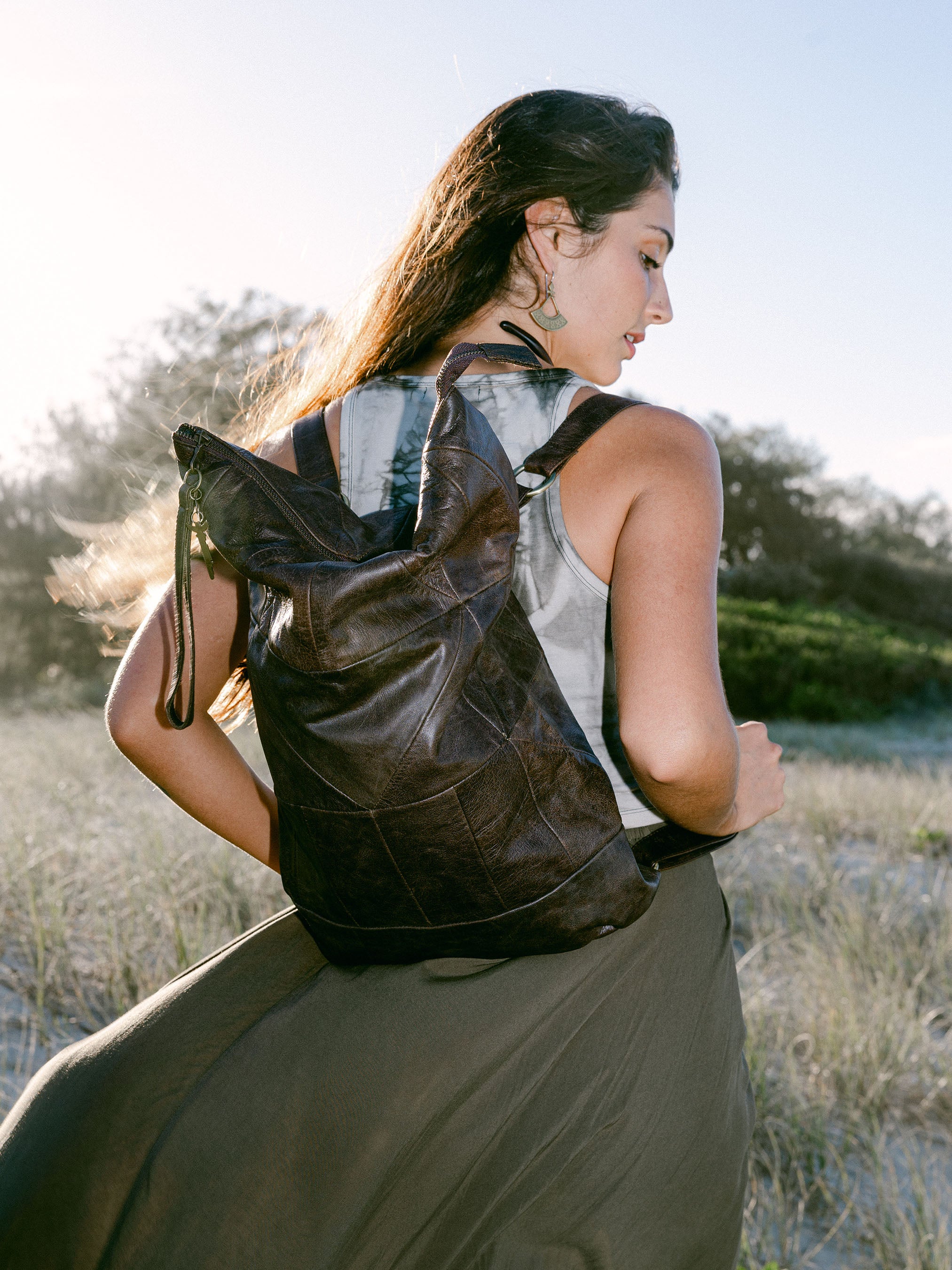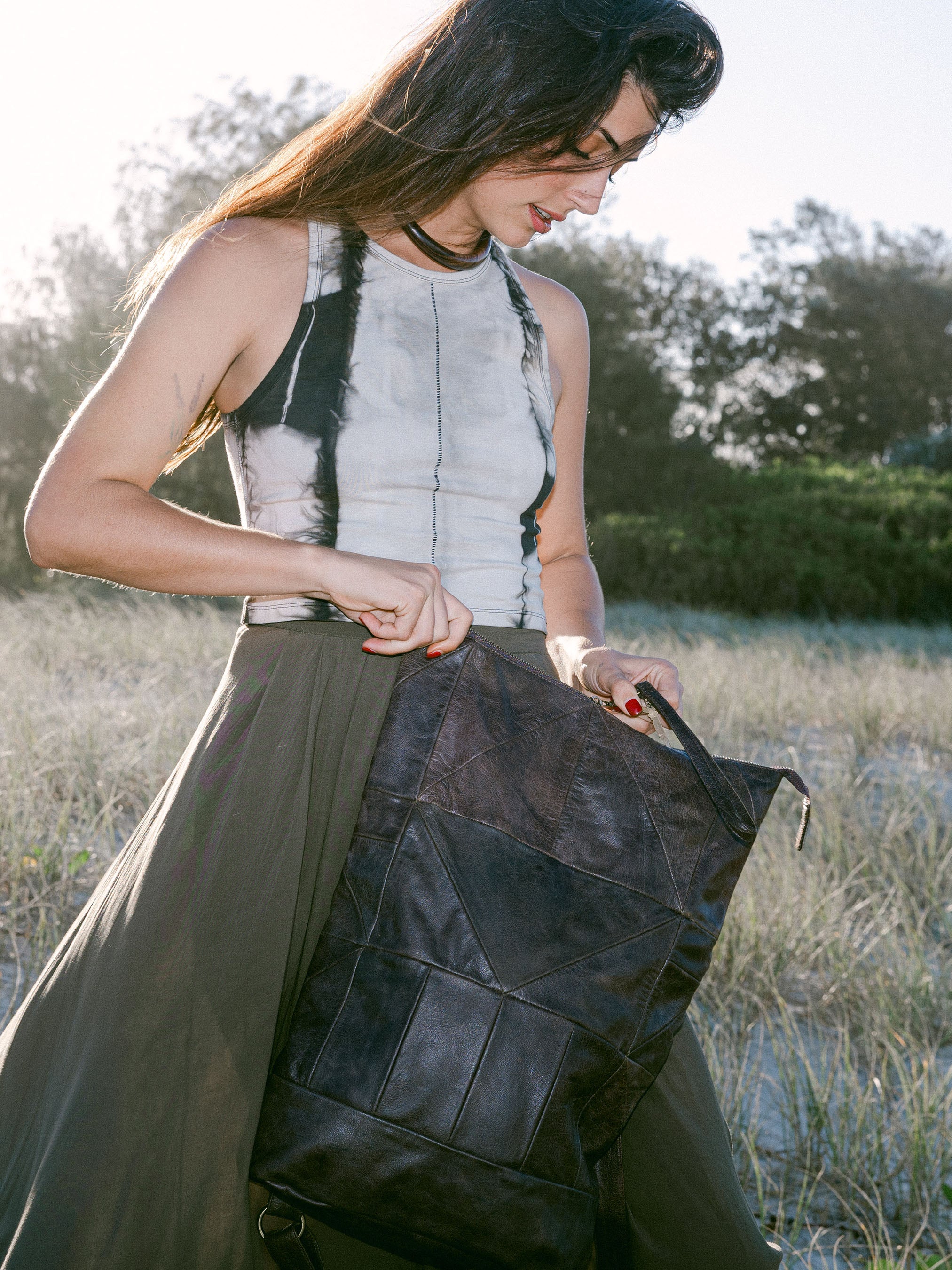 Constructed from black leather sheep skin, lined with traditional balinese IKAT.