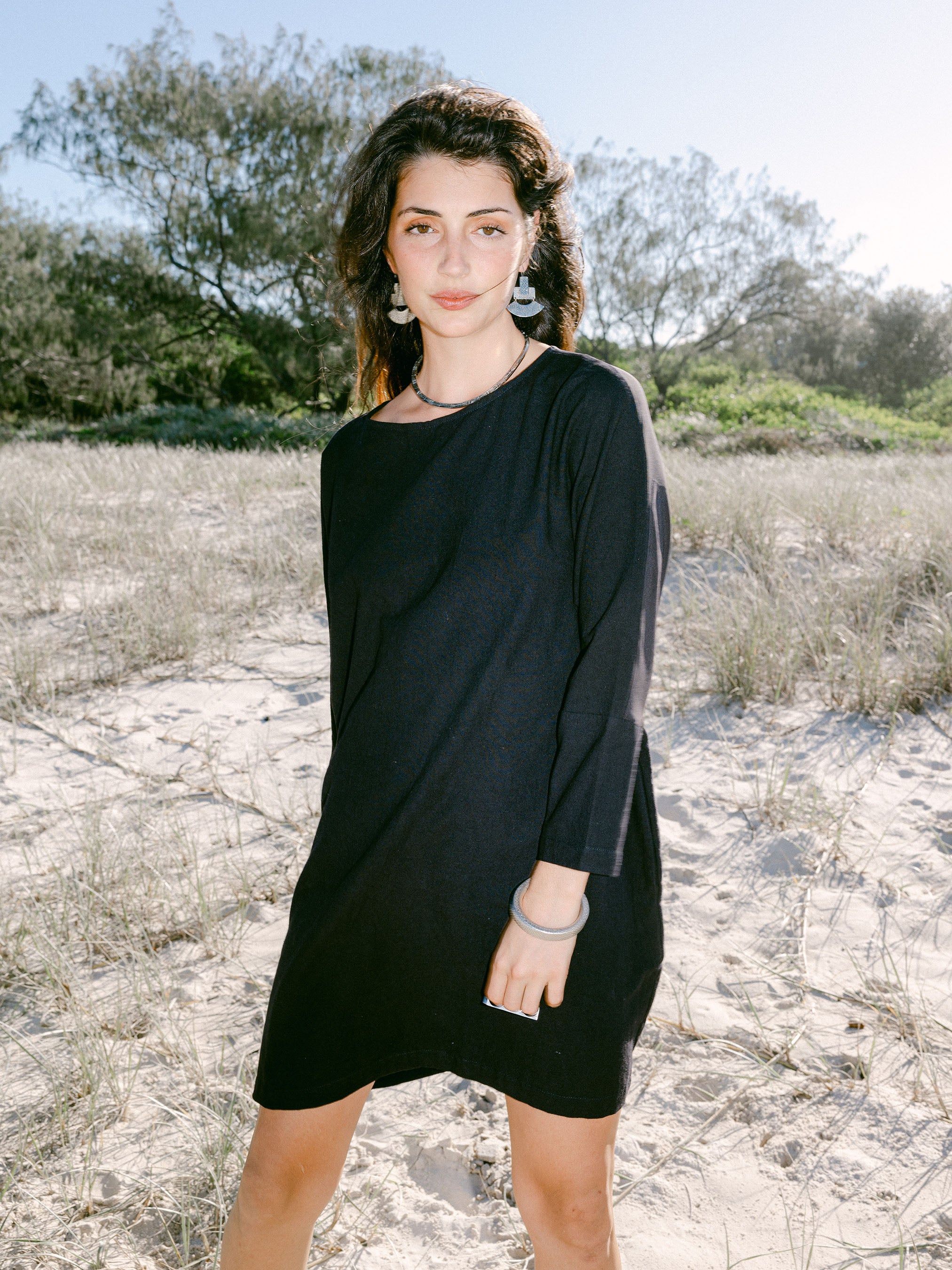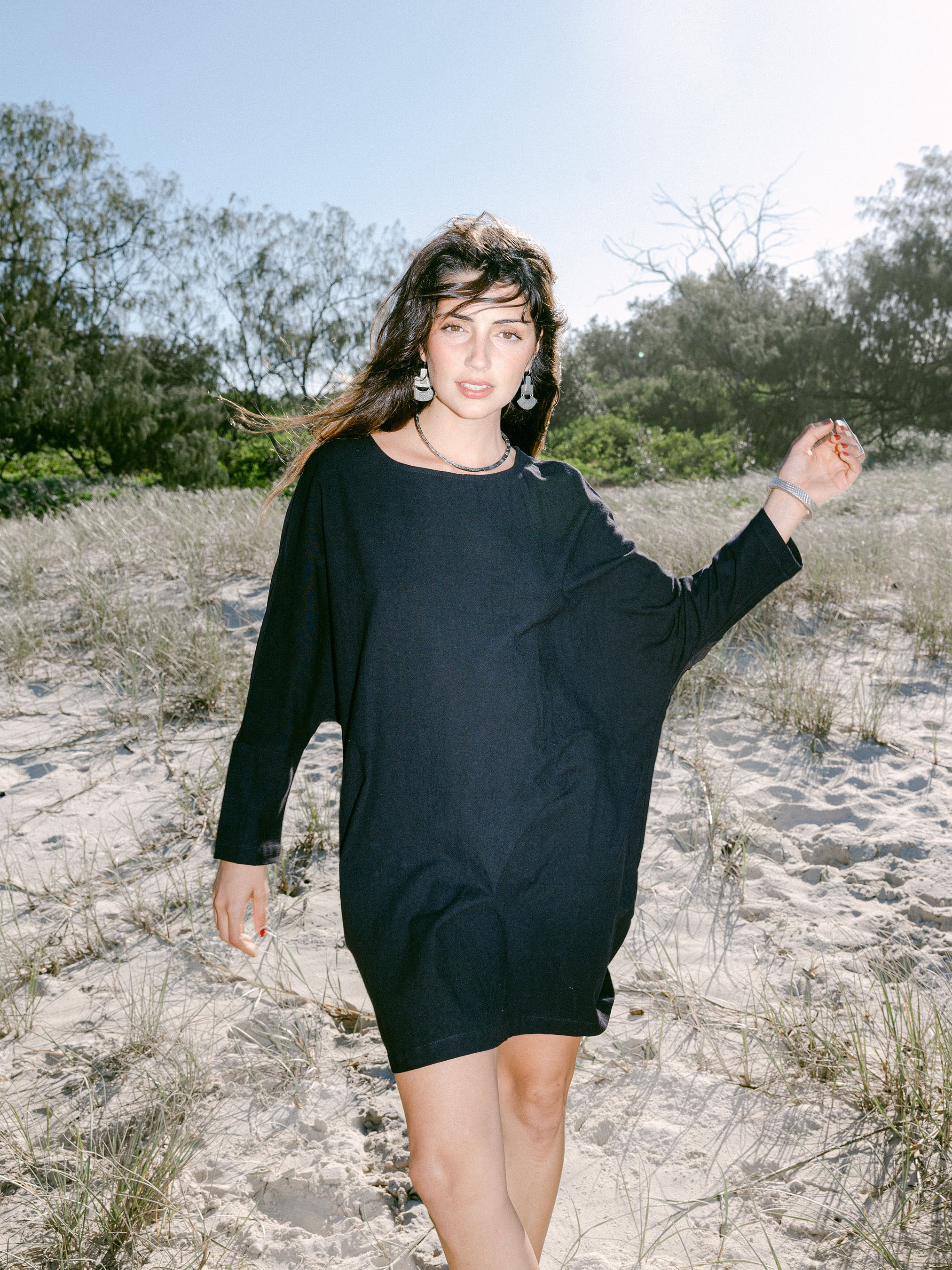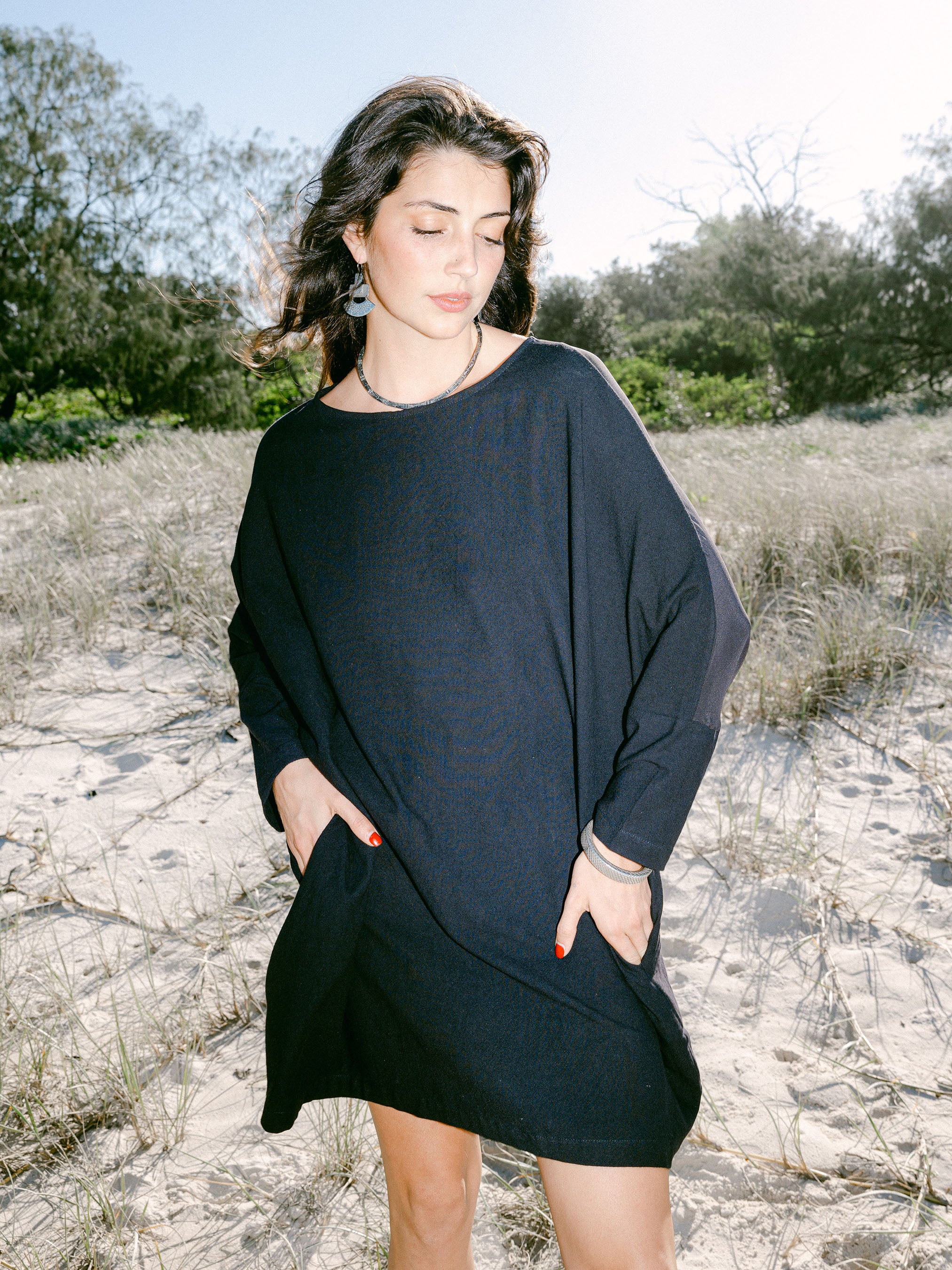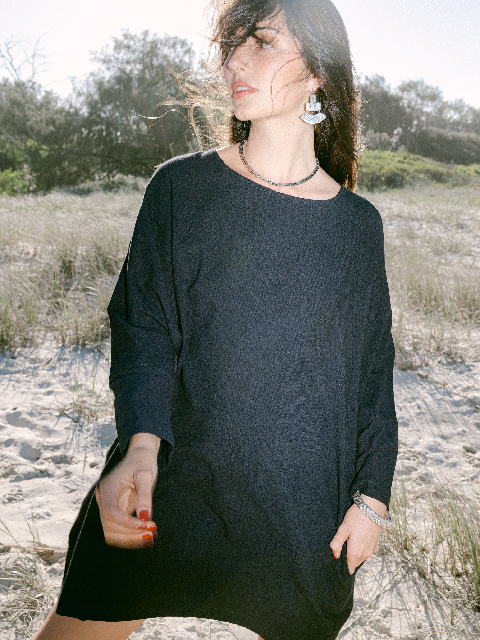 Constructed from a Mid weight linen with a silk panel across the sholders for a lux slinky feel, big side pockets.