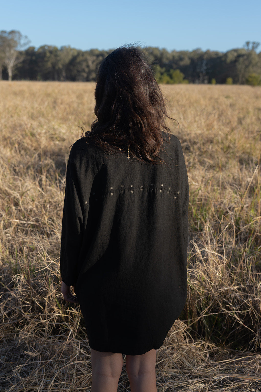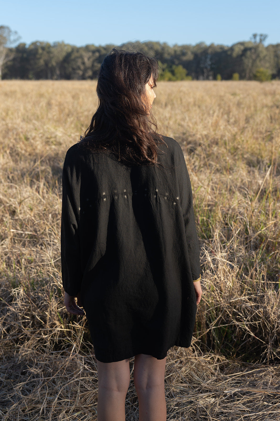 Constructed from a Mid weight linen with big side pockets, we have used a unique dye technique to give a splash of stars across the shoulders.