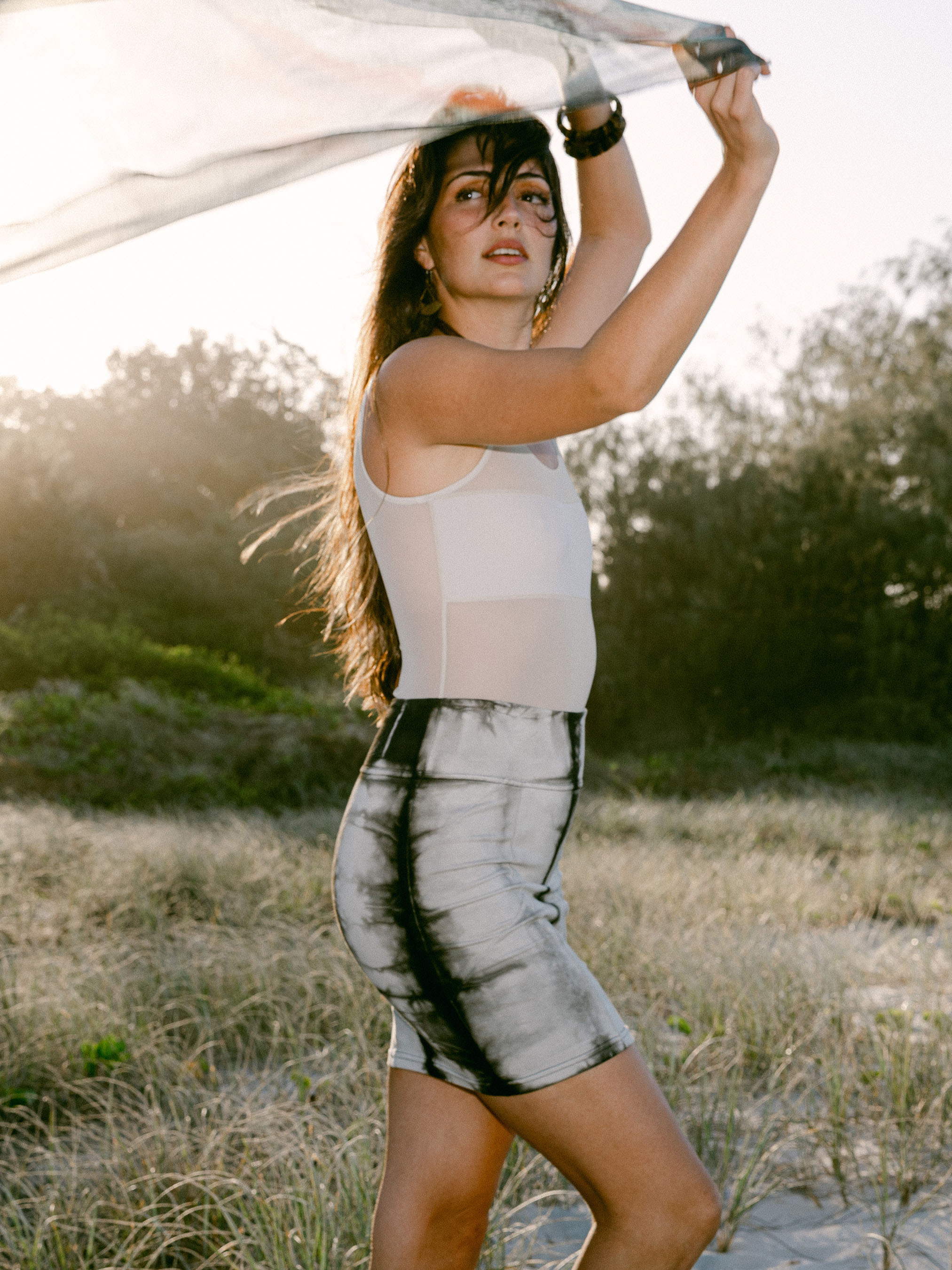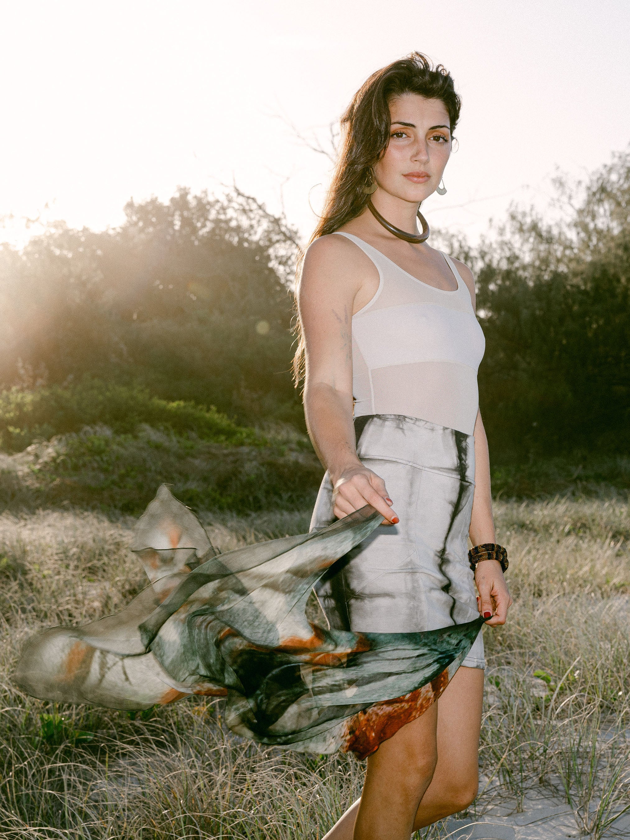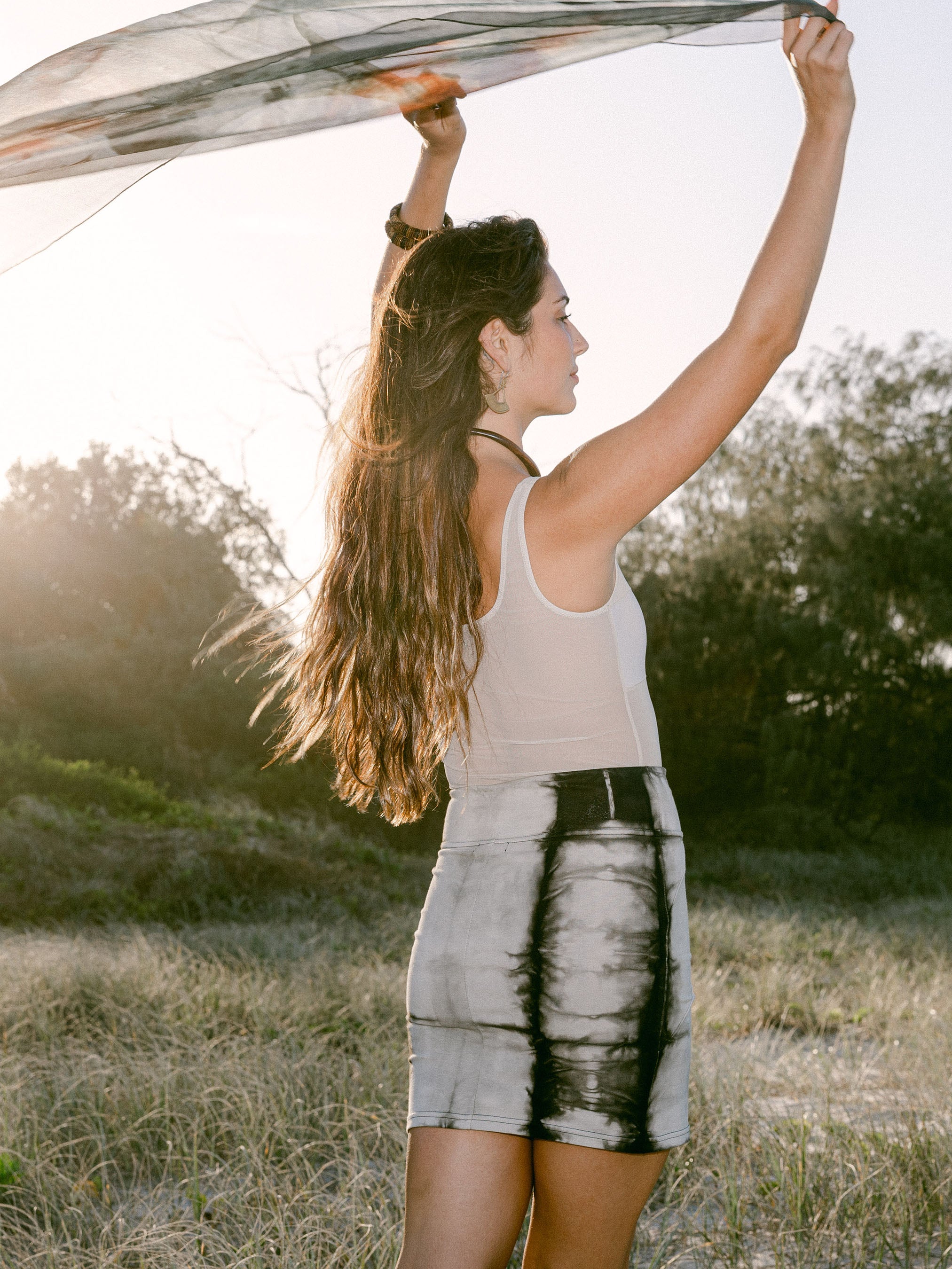 Our Plant dyed mini is made from a mid weight organic cotton lycra. Dyed in a unique shibori style using Indian almond leaf as a plant dye.