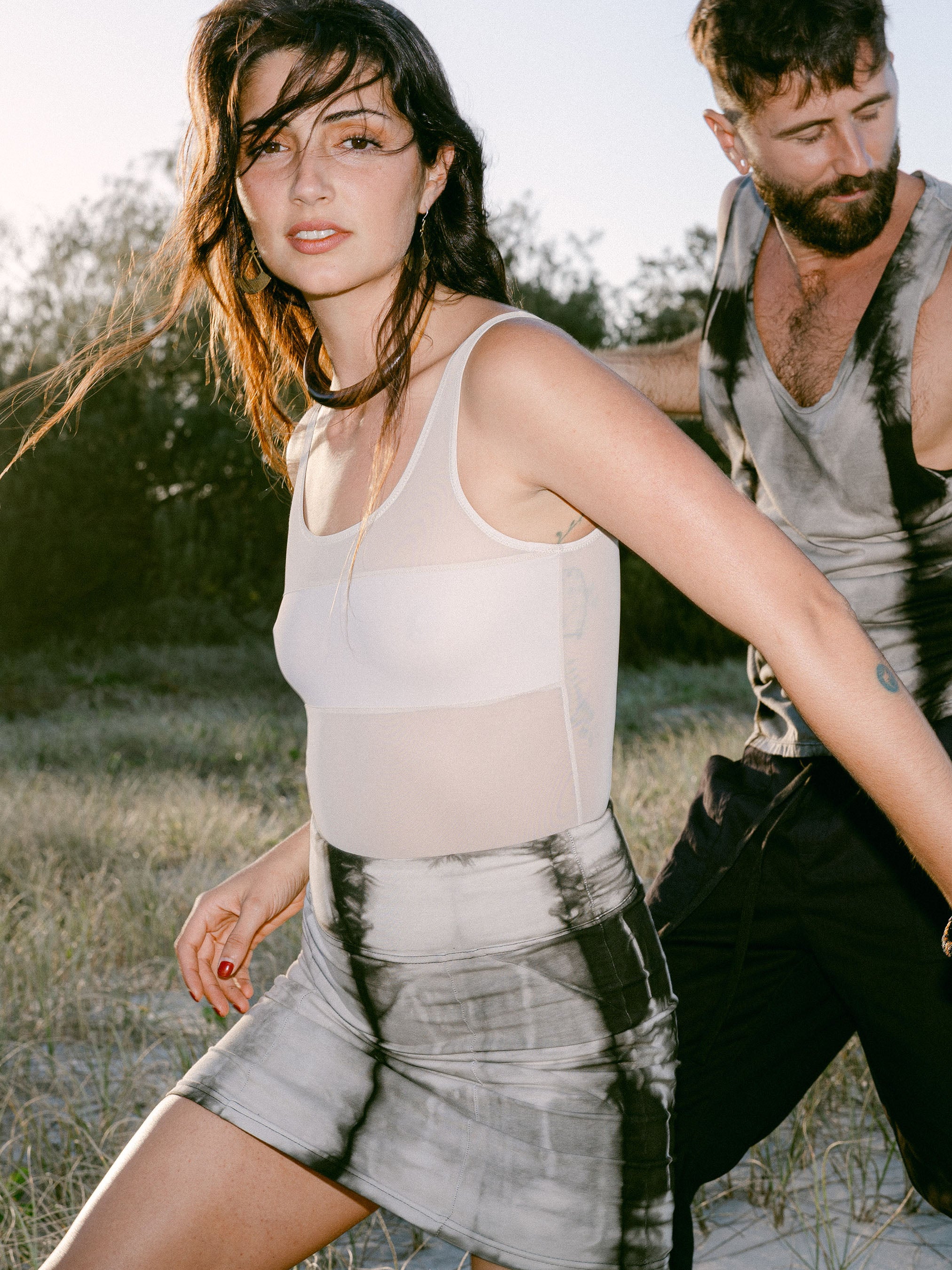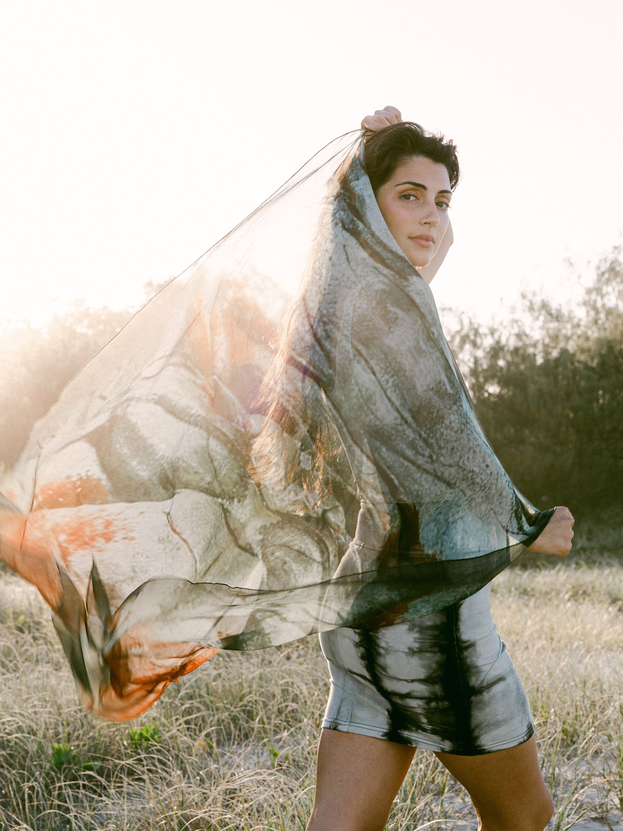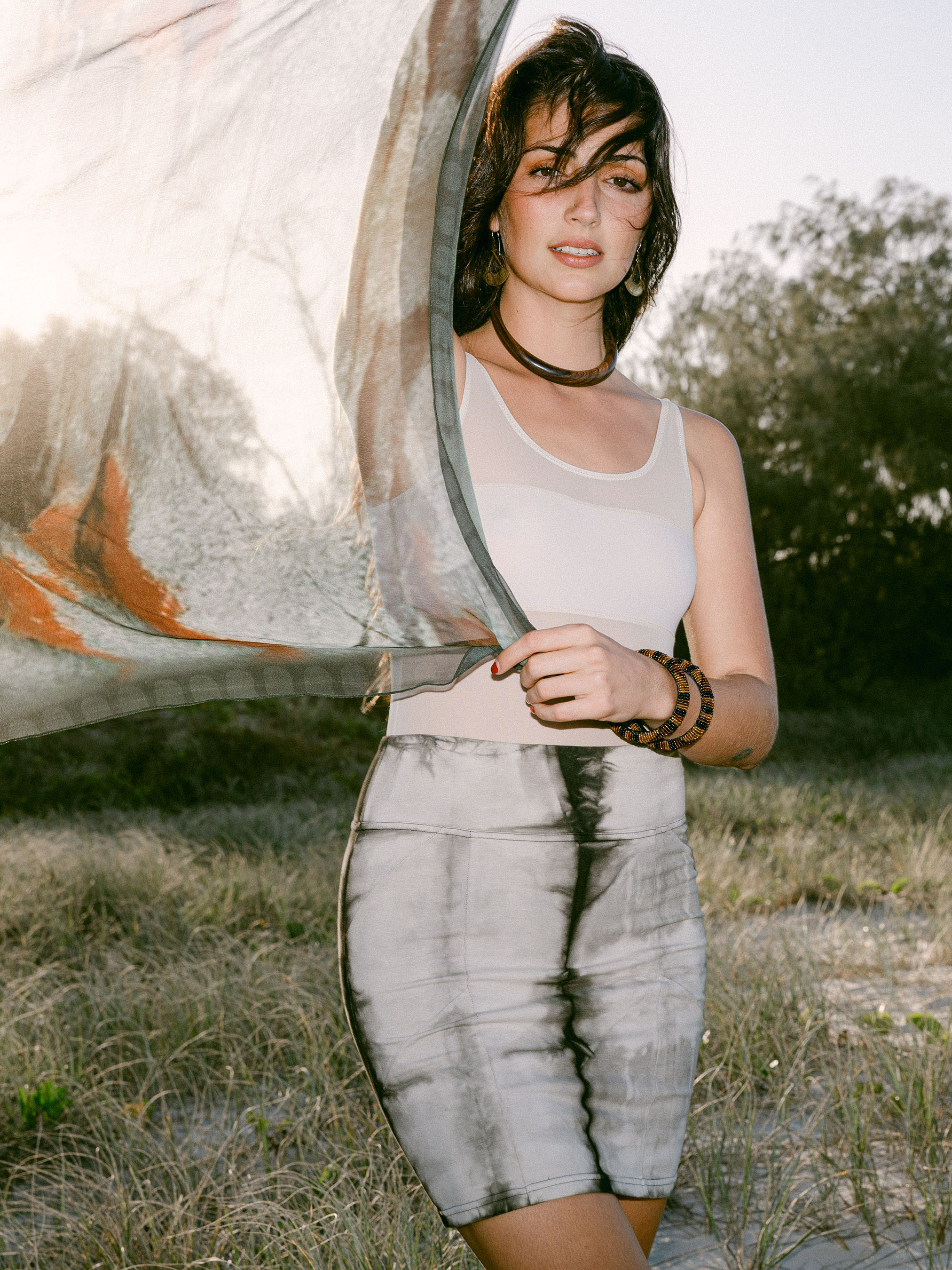 Our Plant dyed mini is made from a mid weight organic cotton lycra. Dyed in a unique shibori style using Indian almond leaf as a plant dye.