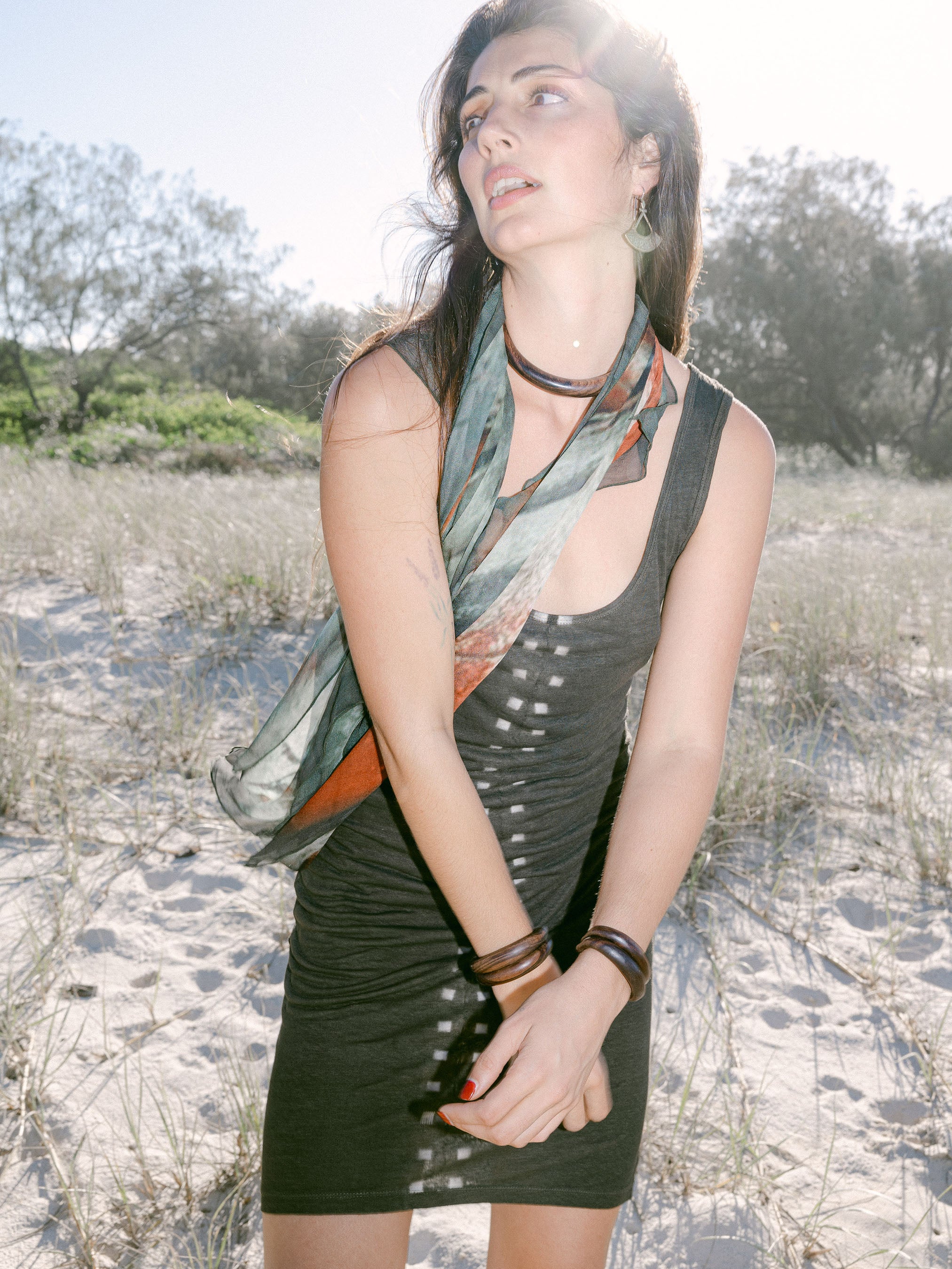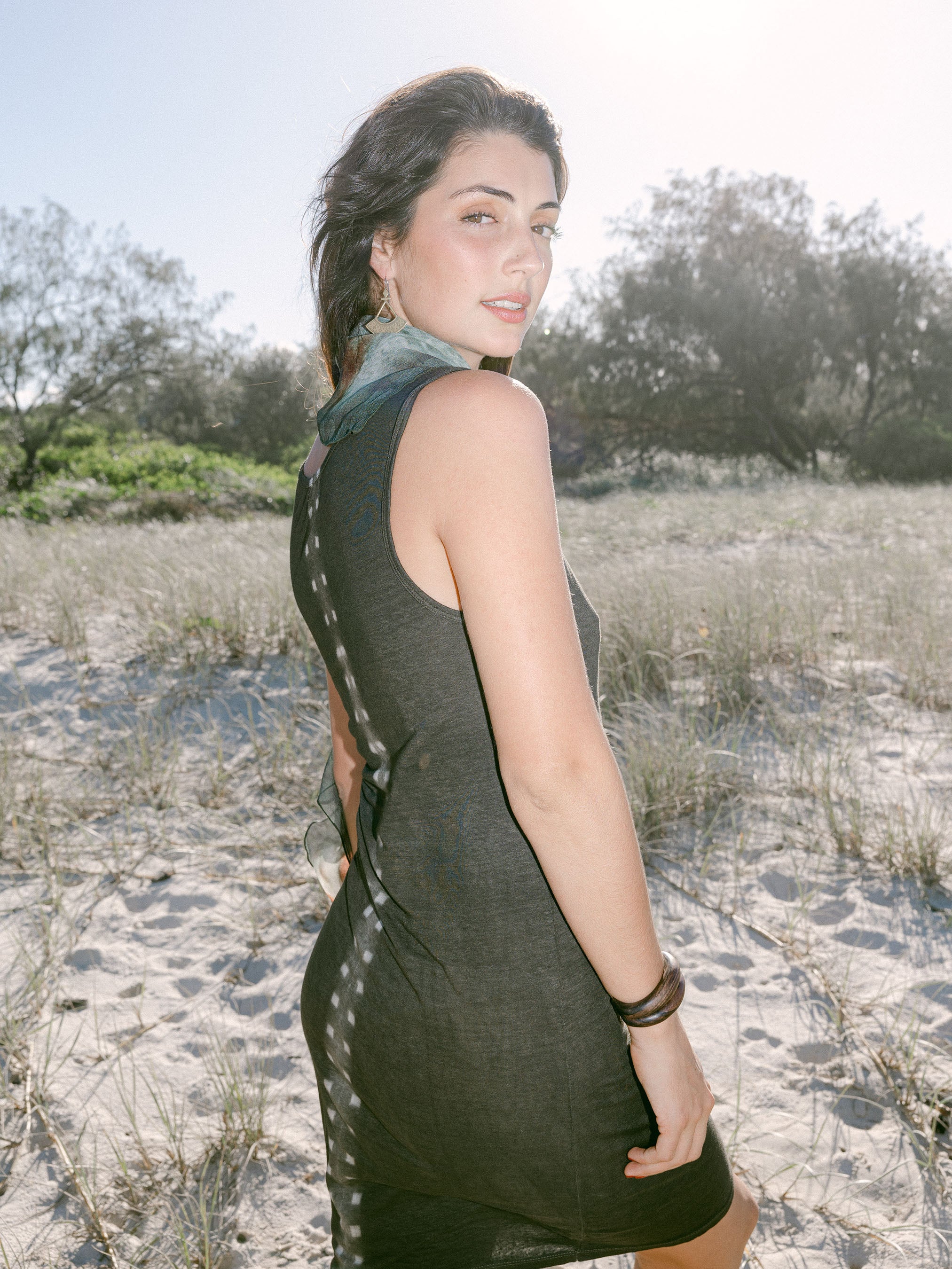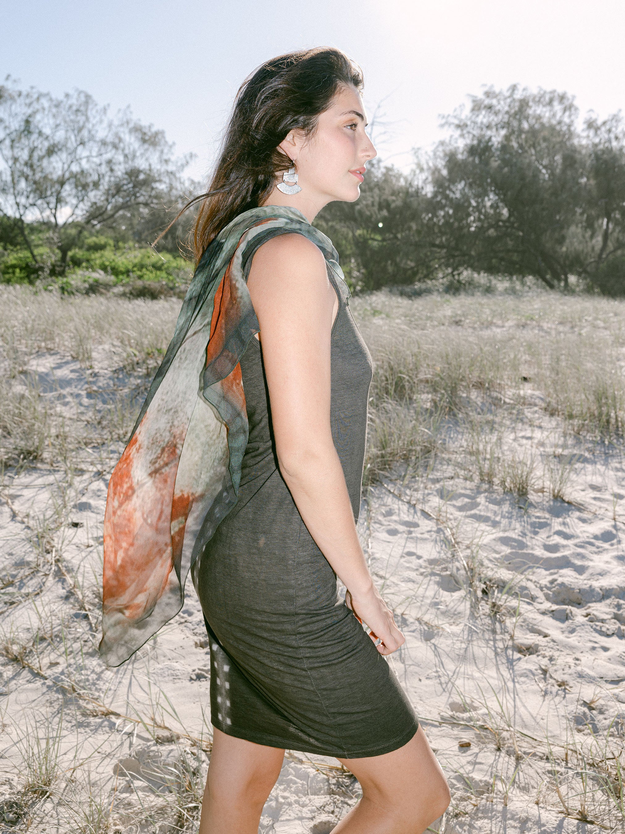 Our Plant dyed Linen tank dress is dyed in a unique shibori style using Indian almond leaf as a plant dye.