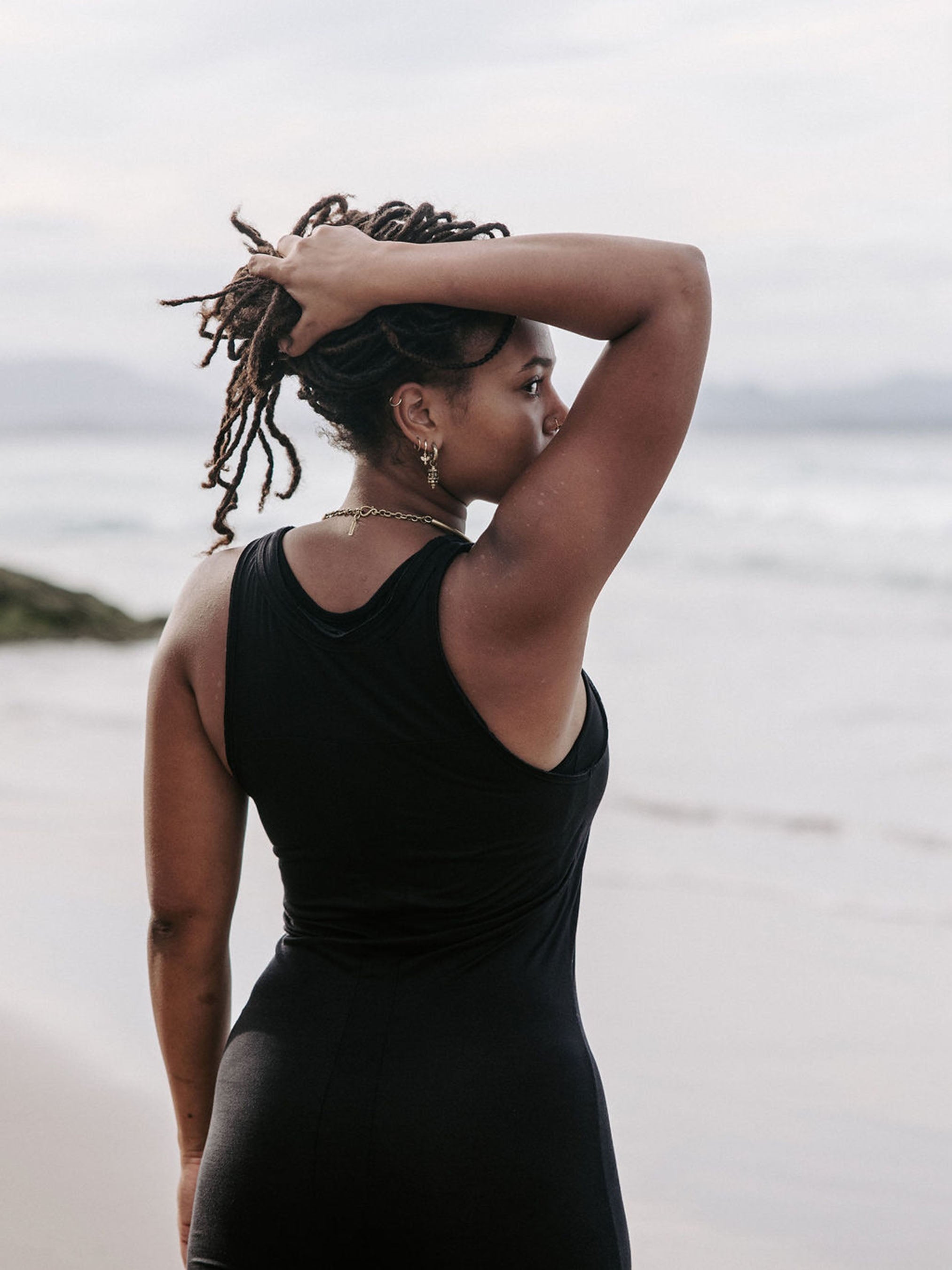 Our Slinky B dress, is a form fitting tank dress with high front split and a soft bamboo like feel.