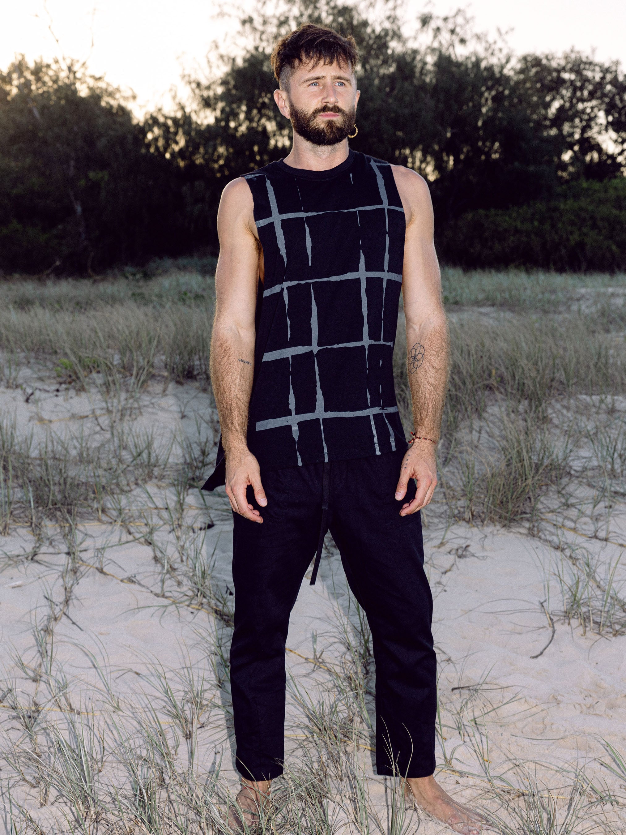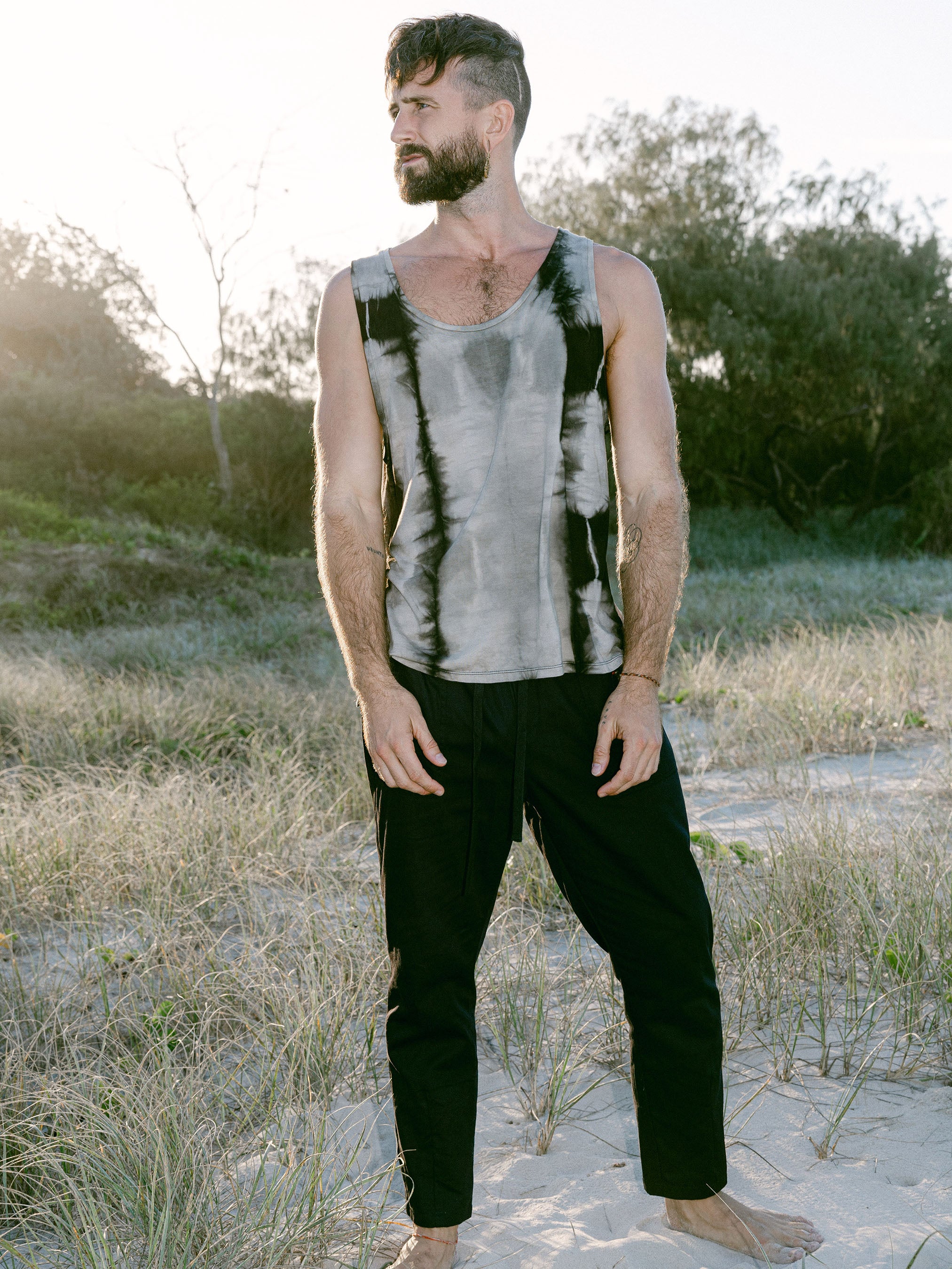 Our pants are constructed from a medium weight cotton, with big side pockets, zipped back pockets, and drawstring waist.