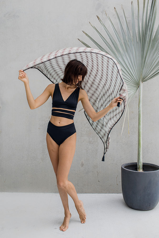 Made from 100% pure silk, digitally printed with my ‘sacred skin’ artwork. With a black mini pompom boarder and tassels on each corner.